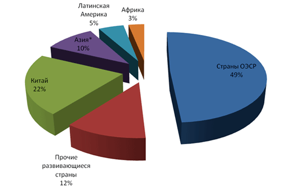 За последние десятилетия произошли заметные региональные сдвиги в производстве электроэнергии (рис. 5). Существенно сократилась доля развитых стран (ОЭСР) – с 73% в 1973 г. до 49% в 2011 г. Одновременно выросли доли развивающихся стран Африки, Латинской Америки и Азии, прежде всего Китая, на который теперь приходится более 20% мирового производства электроэнергии (в 1973 г. – 3%).