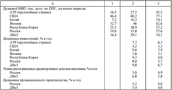 Макроэкономические прогнозные характеристики развития крупнейших стран АТР, России и ДВиЗ, соответствующие инерционному и инновационному (оптимистическому) сценариям социально-экономического развития до 2030 г., приведены в табл. 1 и 2.